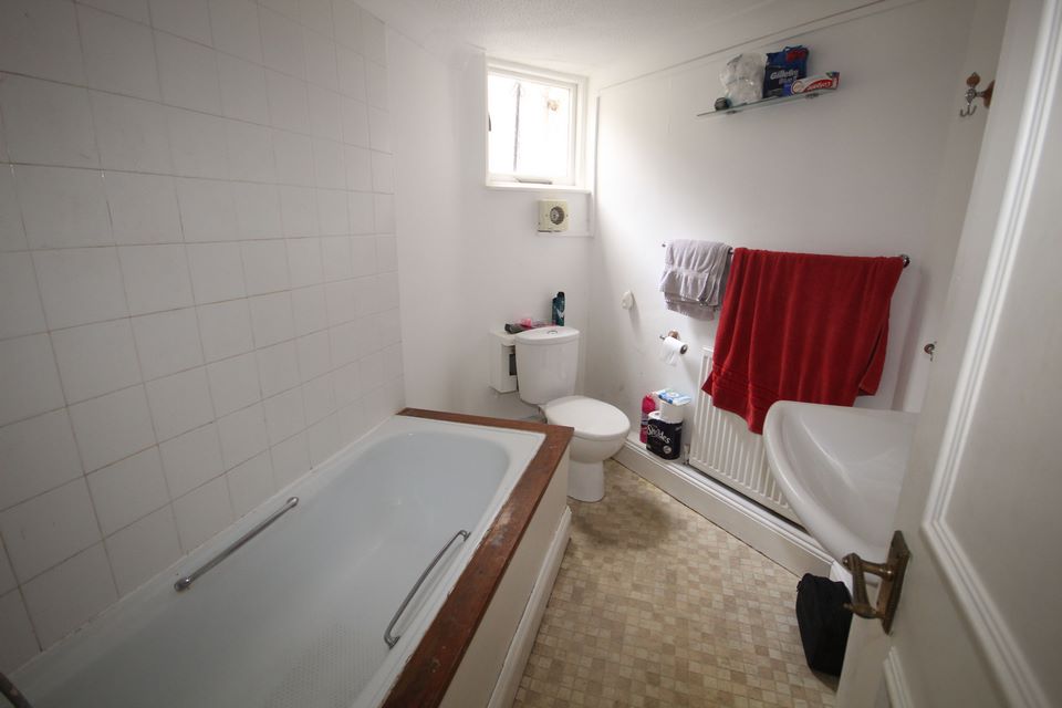 White suite comprising modern panelled bath with mixer tap and shower, pedestal wash hand basin, low level WC, tiled surrounds, window, radiator.