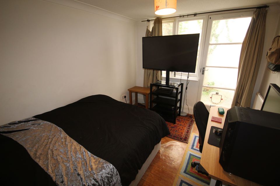 13'1 x 11'5 wood laminate flooring, shelving, power points, TV point, telephone point, radiator.