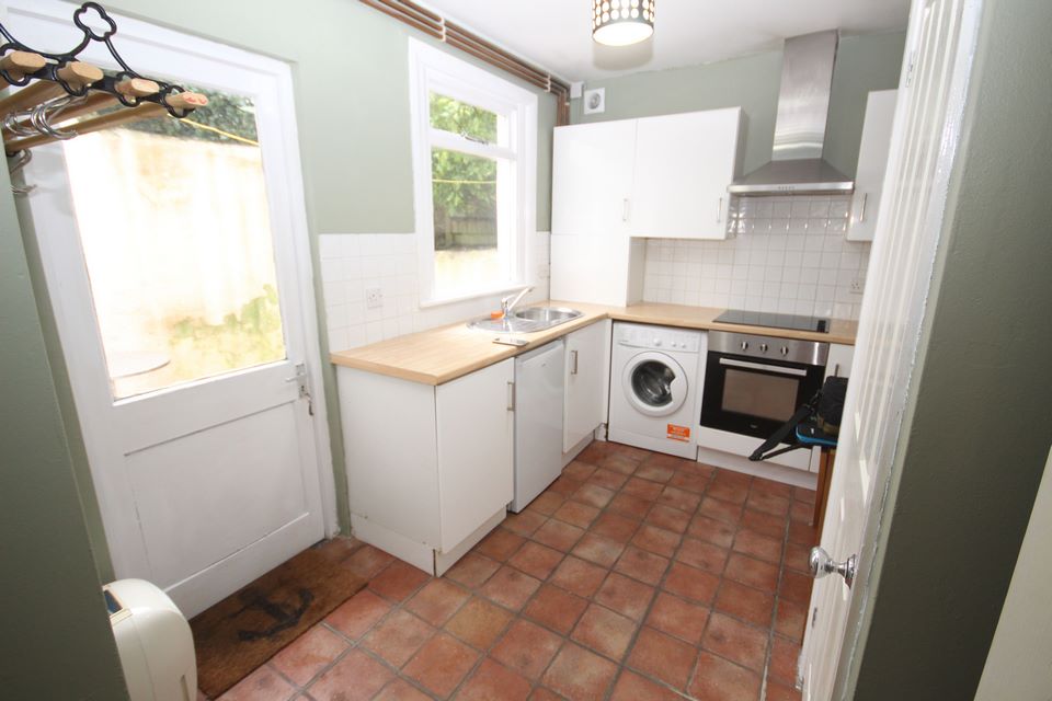 KITCHEN 11'7" (3.53m) x 8'1" (2.46m) single drainer stainless steel sink unit inset in working surfaces, ceramic hob with oven under and extractor over, drawers and cupboards under, eye level cupboards, gas fired combi central heating boiler, tiled surrounds, power points, tiled flooring, washing machine and fridge, useful cupboard, door to rear garden.