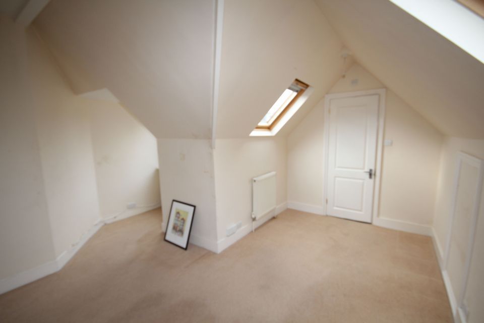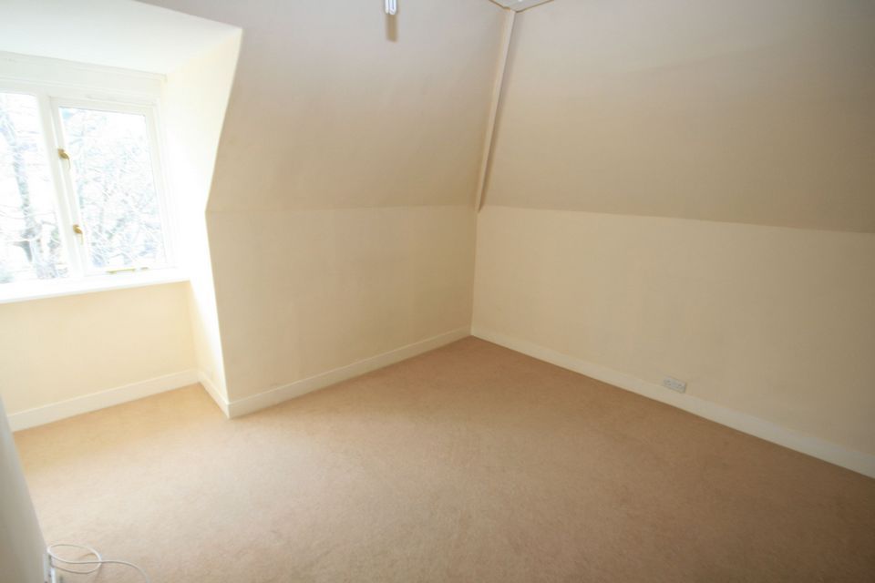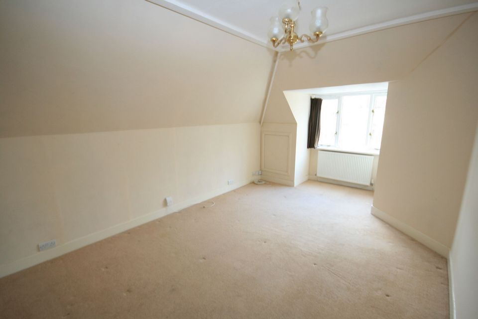 BEDROOM 1 16' (4.88m) x 11'4" (3.45m) max L-shaped and with sloping ceilings, bay window, radiator, power points.