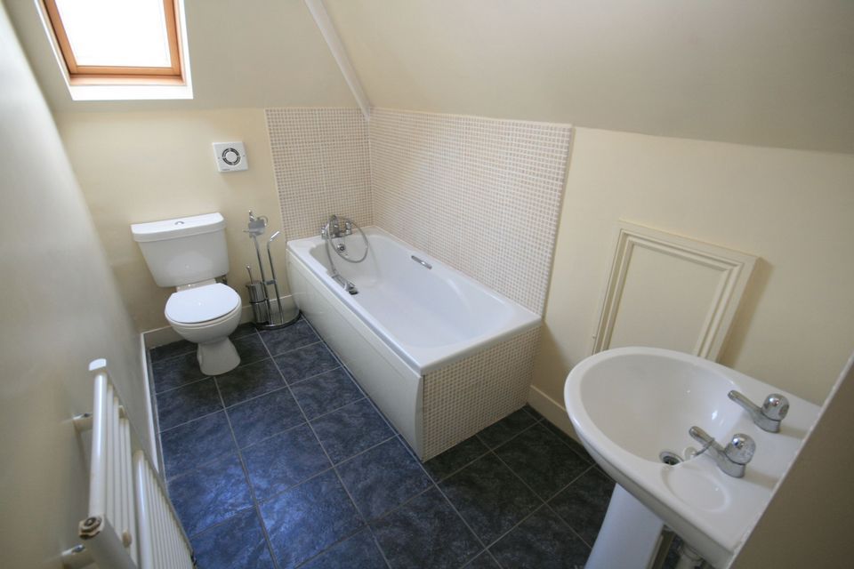 MAIN BATHROOM white suite comprising modern panelled bath mixer tap and shower, wash hand basin, low level WC, tiled surrounds, radiator.