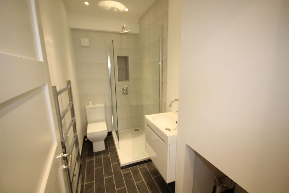 Large tiled shower cubicle, wash hand basin, low level w.c, chrome radiator, tiled flooring, plumbing for washing machine.