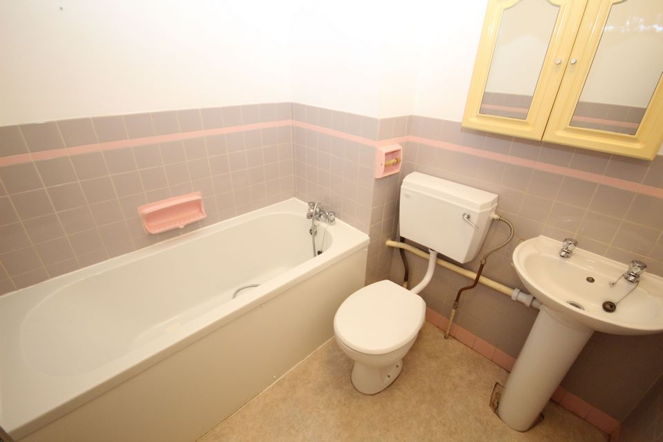 BATHROOM white suite comprising modern panelled bath mixer tap and shower, pedestal wash hand basin, low level WC, tiled surrounds, electric heater.