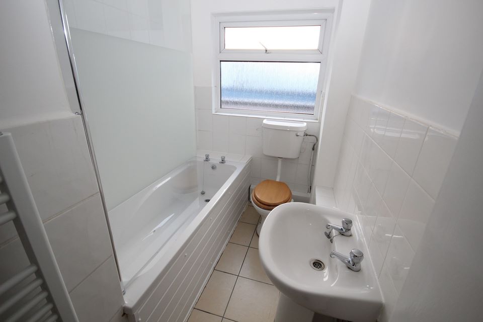 BATHROOM white suit comprising modern panelled bath, separate electric shower, pedestal wash hand basin, low level WC, tiled surrounds, heated towel rail, window.