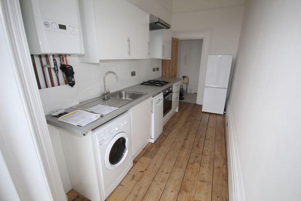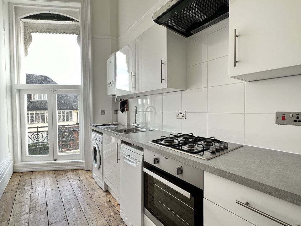 KITCHEN 16'2" (4.93m) x 6'2" (1.88m) well fitted with single drainer stainless steel sink unit inset in working surfaces, gas hob unit with oven under and extractor over, range of drawers and cupboards, eye level cupboards, tiled surrounds, power points, stripped floor boards, washing machine, dishwasher, fridge / freezer, window door opening to balcony.