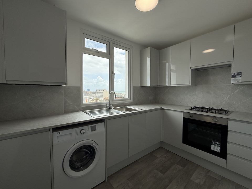 Newly Fitted kitchen. Grey wall units with extractor hood over. Electric Oven with stainless steel gas hob inset in laminated worktops. Stainless steel sink with chrome mixer taps. Lino flooring, power points, washing machine and space for fridge freezer. Cupboard housing the gas fired boiler