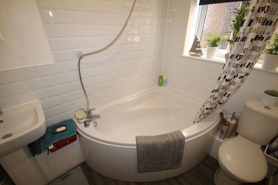 BATHROOM white suite comprising modern panelled corner bath, mixer tap and shower, pedestal wash hand basin, low level WC, tiled surrounds.chrome radiator.